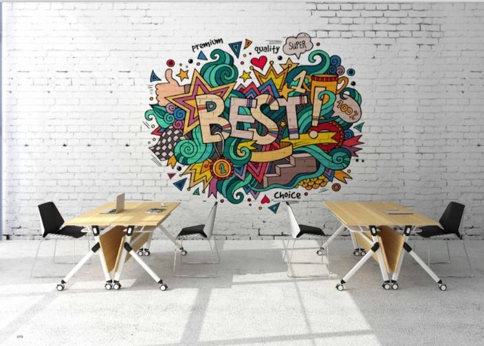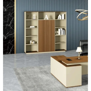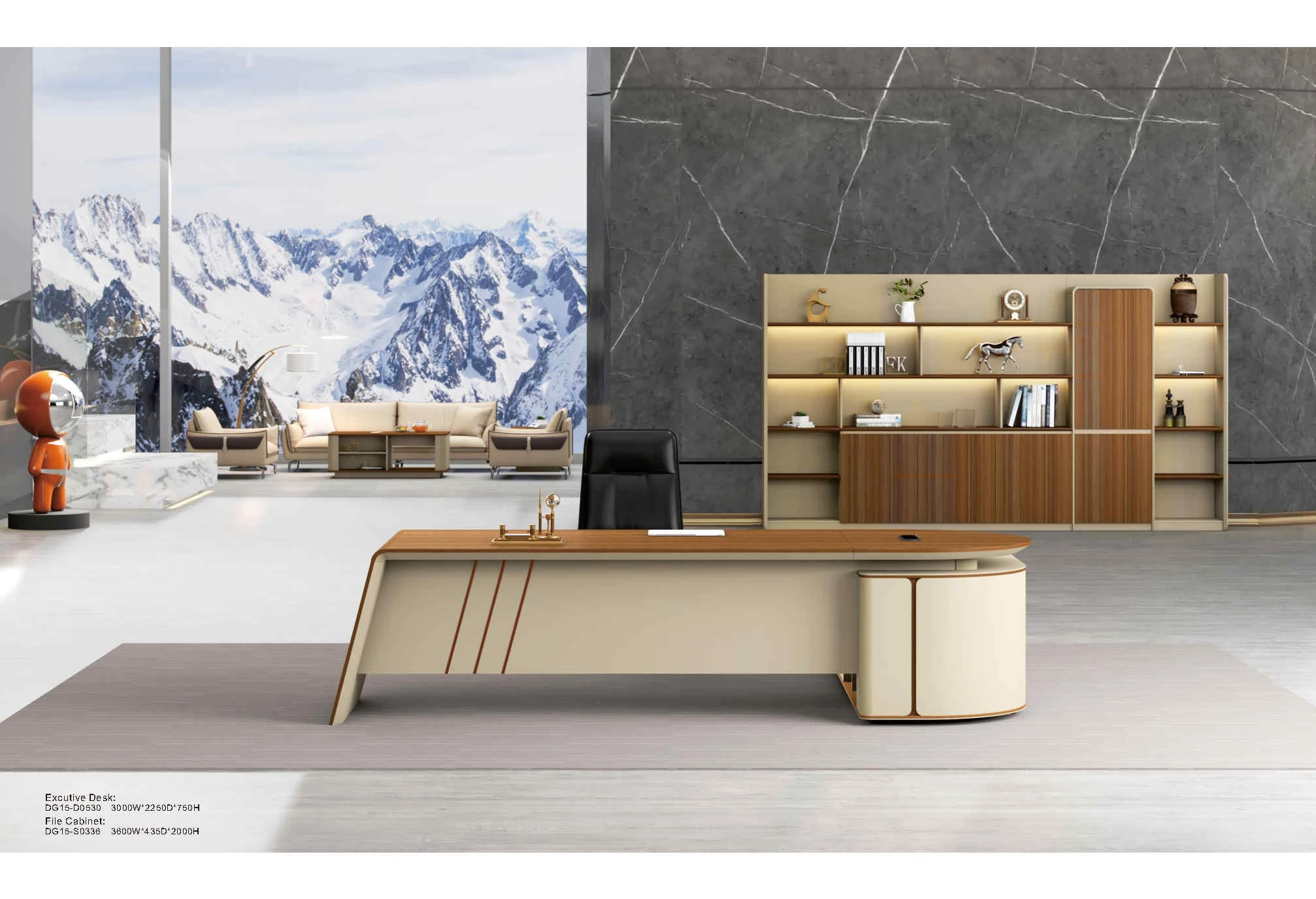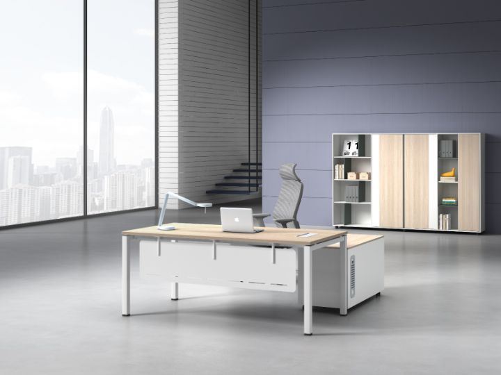 - Design: The set is dressed in a white metal background veil. This facade brings a modern and bright touch, while concealing the cables for a sleek workspace.