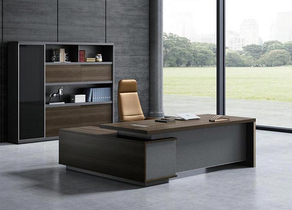 - The style: The combination of walnut-colored wood, matte black and dark gray detail confirms the premium and statutory positioning of this executive office.