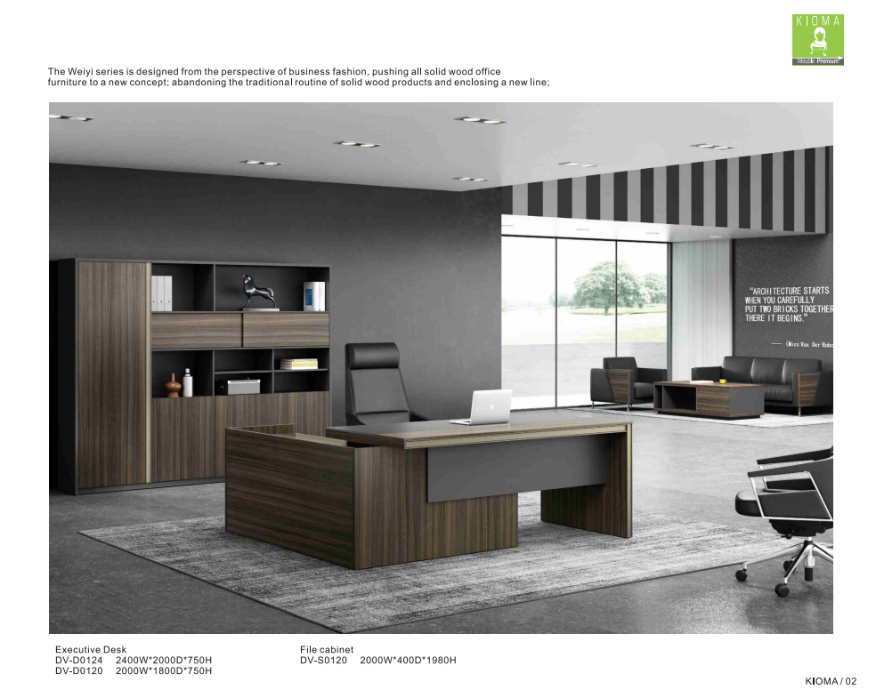 - The style: The combination of walnut-colored wood, matte black and dark gray detail confirms the premium and statutory positioning of this executive office.